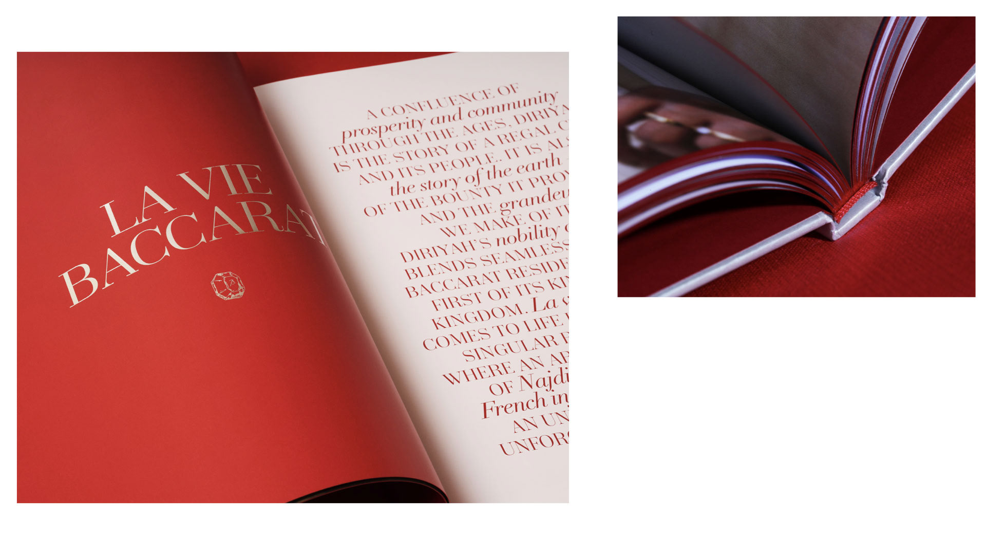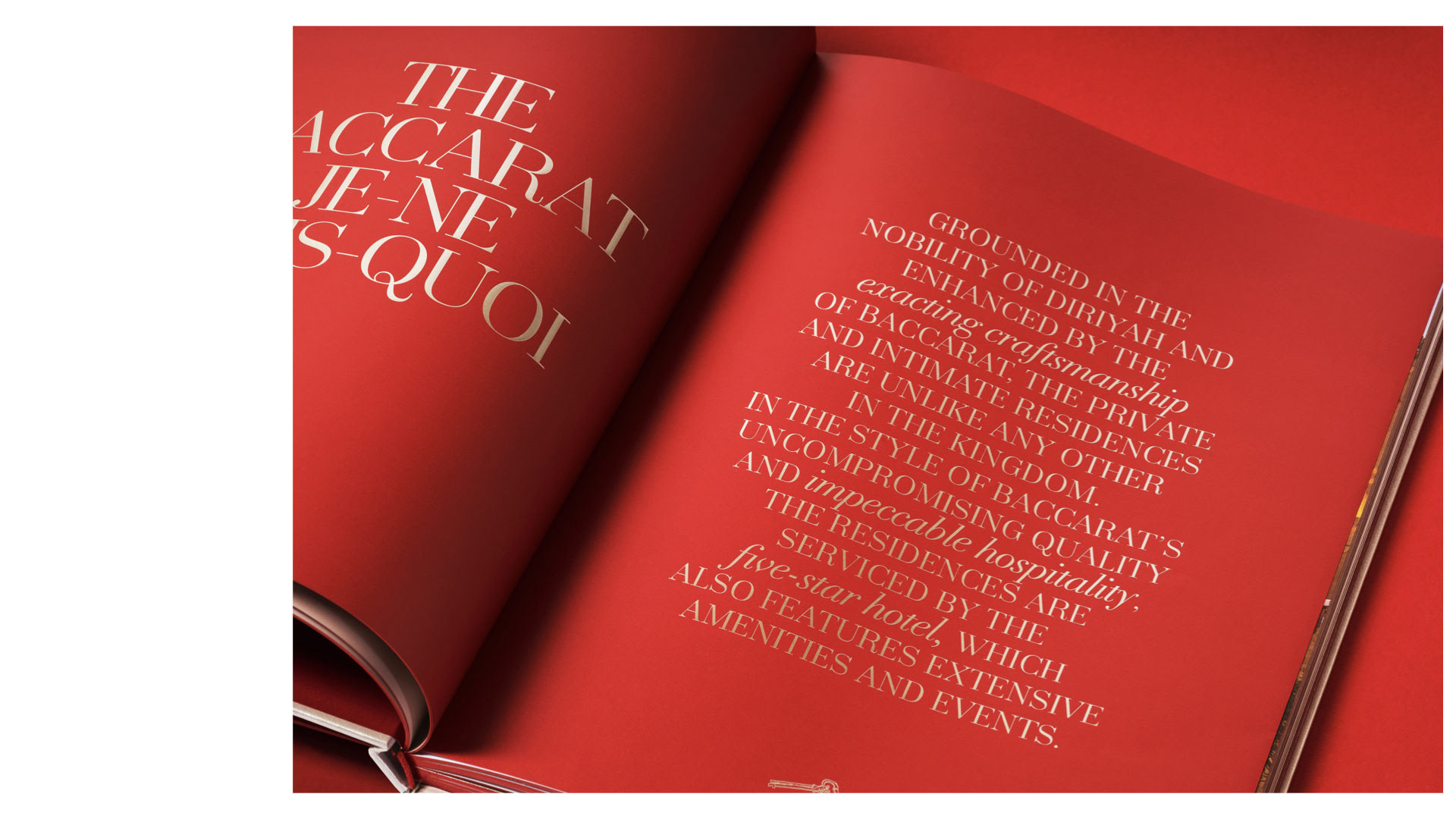 La Vie Baccarat comes to life in Baccarat Residences Diriyah, the brand’s first residential development in the Kingdom of Saudi Arabia. An artful amalgam of Najdi heritage and French influence, the residences merge seamlessly with Diriyah's grounded nobility. Diriyah Company tapped Conway+ to develop the brand identity and marketing materials for the project, with the goal of communicating both Diriyah's inherent majesty and Baccarat's impeccable hospitality and craftsmanship. The challenge was to create a brand that would resonate on a global scale while remaining deeply rooted in local culture in order to reach UHNWIs in Saudi Arabia and the Gulf. Drawing inspiration from Diriyah’s mudbrick architecture and earthen landscape, we developed the concept Brilliance Unearthed, which connected the natural simplicity of sand with the opulence of crystal. The collateral, including a full sales kit and a custom coffee table brochure, conveyed the intrinsic luxury of both the brand and the destination.